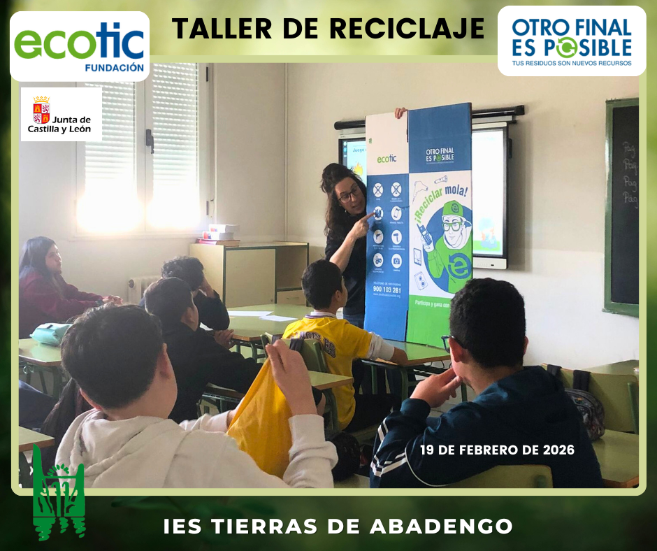 Hoy, el alumnado de 1.º y 2.º de ESO del IES Tierras de Abadengo ha participado en un interesante taller sobre el reciclaje de residuos de aparatos eléctricos y electrónicos (RAEE), desarrollado dentro del programa Otro final es posible. Este proyecto, centrado en la concienciación ambiental y la economía circular, ofrece recursos educativos para fomentar un uso responsable de los dispositivos electrónicos y promover hábitos sostenibles.