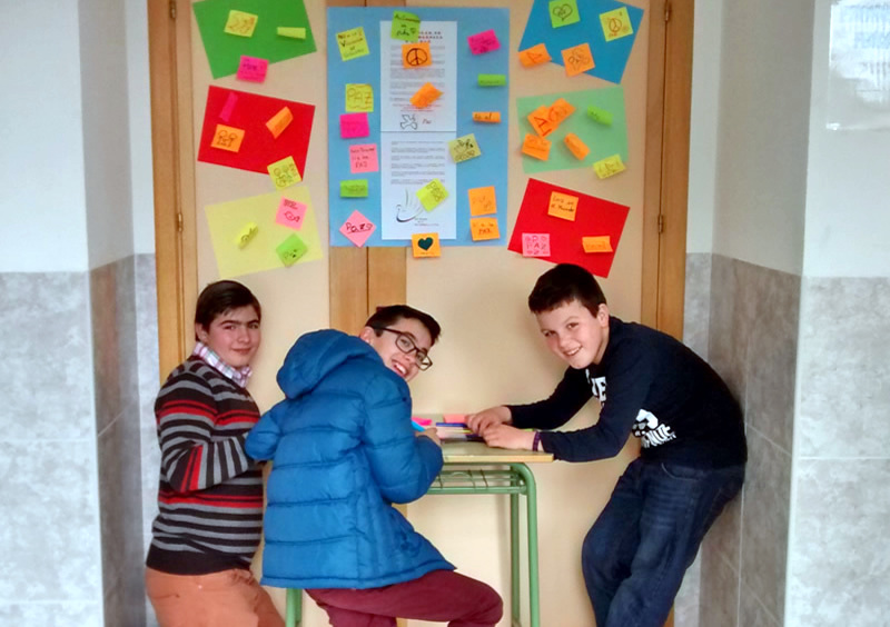 Algunas alumnas y alumnos colaboran en el desarrollo de la actividad programada para la celebración de esta efeméride, aportando sus pegatinas al mural situado en uno de los pasillos del Centro. A la vez controlan que el resto de sus compañeros lo hagan también de forma ordenada. Y, especialmente, interiorizan las reflexiones y comentarios que previamente han tenido lugar en las clases sobre la importancia que se desprende de la celebración de este día y su significado. |