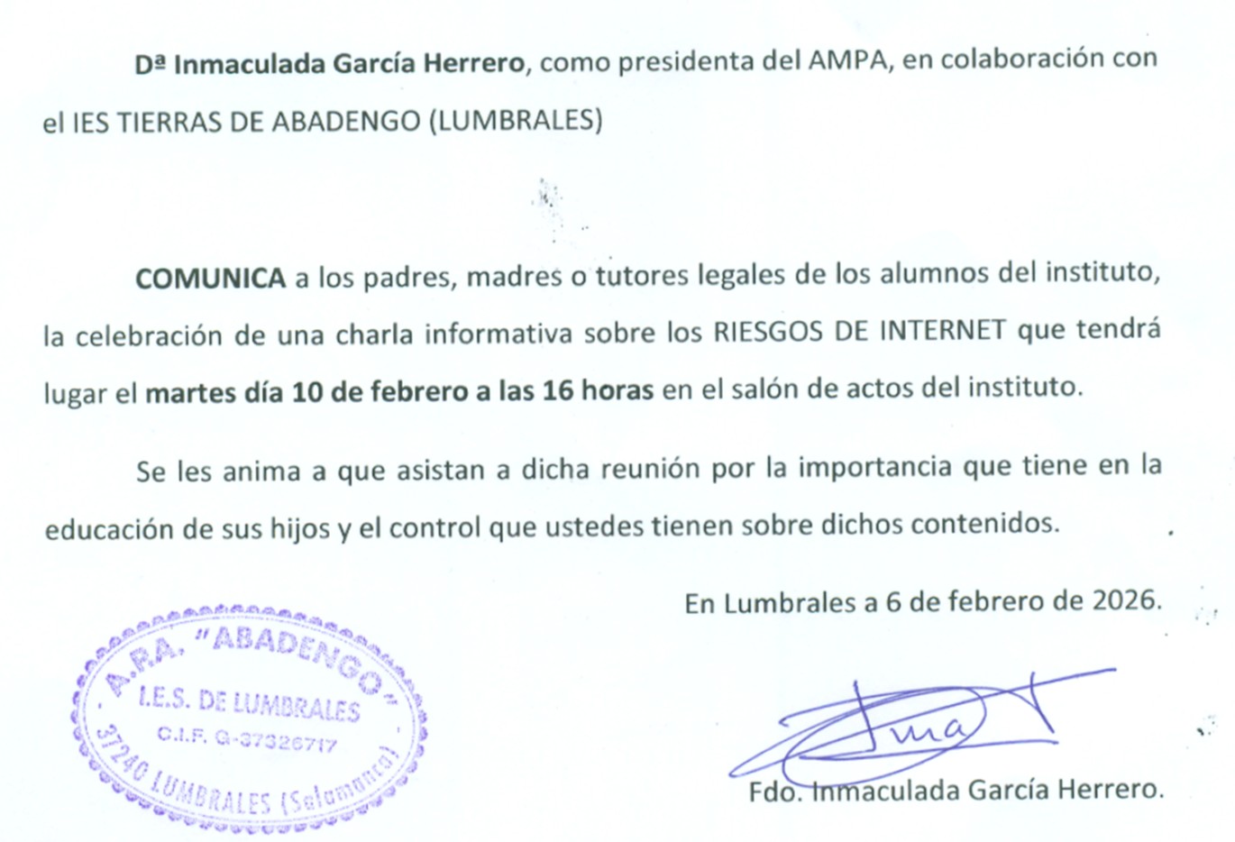 Charla Informativa sobre LOS RIESGOS DE INTERNET😎 Para padres, madres o tutores de los alumnos del instituto. 📆 el martes 10 de febrero a las 16 horas. En el salón de actos. |
